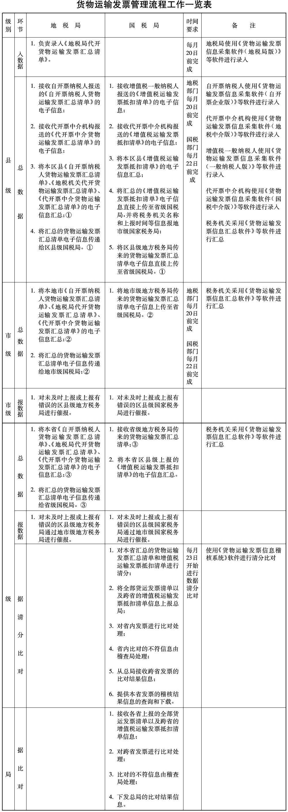 (五)为便于各地抓好落实工作,对上述各环节各部门的工作任务进行了归纳整理,制定了《货物运输发票管理流程工作一览表》(见附表)。